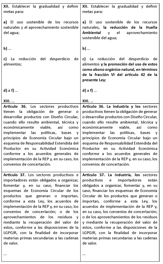 Artículo 36. La industria y los sectores productivos tienen la obligación de generar o desarrollar productos con Diseño Circular, cuando ello resulte ambiental, técnica y económicamente viable, así como implementar las políticas, bases y principios de Economía Circular bajo un esquema de Responsabilidad Extendida del Productor en su Actividad Económica conforme a los acuerdos generales de implementación de la REP y, en su caso, los convenios de concertación.