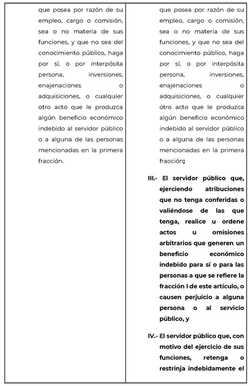 III. El servidor público que, ejerciendo atribuciones que no tenga conferidas o valiéndose de las que tenga, realice u ordene actos u omisiones arbitrarios que generen un beneficio económico indebido para sí o para las personas a que se refiere la fracción I de este artículo, o causen perjuicio a alguna persona o al servicio público, y