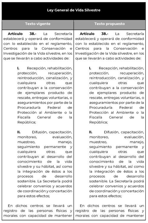 Por lo anterior, se propone modificar el artículo 38 de la Ley General de Vida Silvestre, de acuerdo con la siguiente