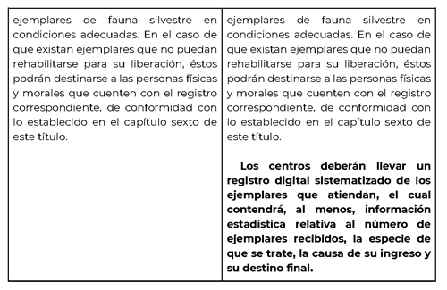 9. Que la incorporación expresa en el artículo 38 de la Ley General de Vida Silvestre de la obligación de llevar un registro digital sistematizado, con información estadística relativa al número de ejemplares ingresados, especie, causa de ingreso y destino final, no constituye una carga administrativa excesiva, sino una medida de fortalecimiento institucional que permite garantizar trazabilidad, transparencia y eficacia en la protección y bienestar de la fauna silvestre bajo custodia del Estado.