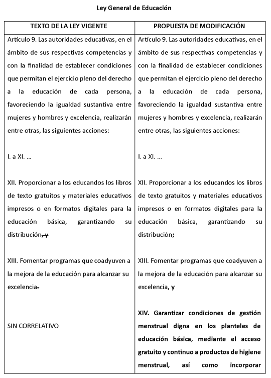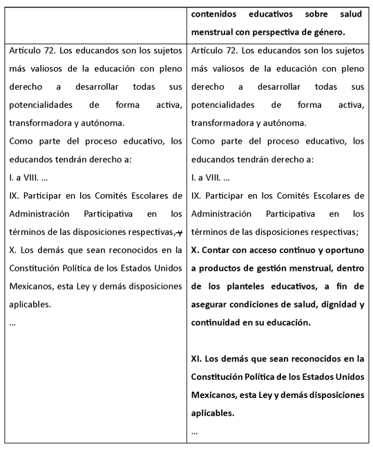 Por lo anterior, la presente iniciativa propone adicionar una fracción al artículo 9 y reformar la fracción X del artículo 72 de la Ley General de Educación a fin de establecer expresamente la obligación de las autoridades educativas de garantizar condiciones de gestión menstrual digna en los planteles de educación básica, mediante el acceso gratuito y continuo a productos de higiene menstrual, infraestructura adecuada y la incorporación de contenidos educativos sobre salud menstrual con perspectiva de género, así como implementar como un derecho de los educandos el acceso continuo y oportuno a productos de gestión menstrual, dentro de los planteles educativos, a fin de asegurar condiciones de salud, dignidad y continuidad en su educación.