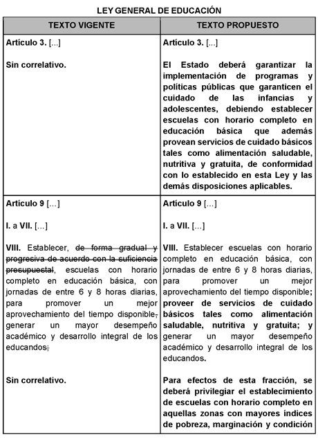 Por su parte, desde la Cámara de Diputados, el Grupo Parlamentario de Movimiento Ciudadano presentó una iniciativa en materia de Sistema Nacional de Cuidados, que contenía una reforma a la Ley General de Salud para obligar al Estado a garantizar programas como las ETC que además prevean servicios como la alimentación gratuita, como parte de la implementación de políticas que garanticen el cuidado de las infancias y adolescencias.18