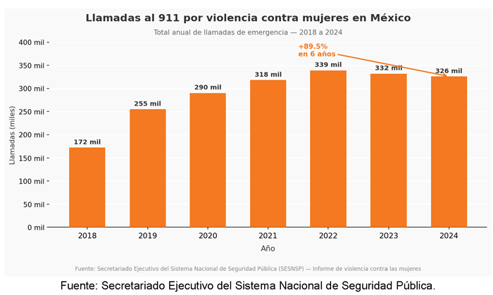 7 Las llamadas al 911 incrementan en 89 por ciento desde 2018, Fábrica de Periodismo, 25 de noviembre de 2025. Disponible en: https://fabricadeperiodismo.com/noticias/llamadas-mujeres-911/
