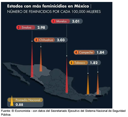 En cuanto a los casos más graves, los registros muestran que los estados con más feminicidios por cada 100 mil mujeres son encabezados por Morelos, Sinaloa, Chihuahua, Campeche y Tabasco.8