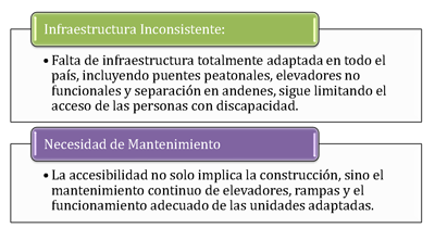 Por otro lado, la accesibilidad universal continúa siendo uno de los principales retos nacionales. Espacios públicos, instalaciones gubernamentales, portales digitales y sistemas de transporte siguen presentando obstáculos físicos y tecnológicos.