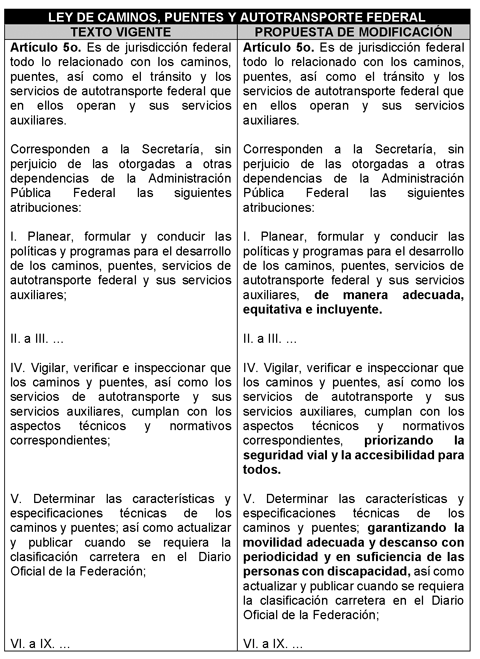 La reforma busca que el autotransporte federal garantice la accesibilidad, incluyendo facilidades en las unidades y en las estaciones de descanso, asegurando la autonomía de las personas con discapacidad, pues en México es importante contar con una planificación y ordenamiento de las ciudades a fin de hacerlas accesibles para todos, de tal manera que es necesario se armonicen los usos del espacio público de manera inclusiva.