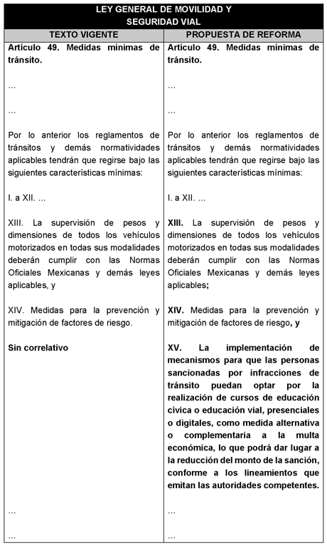 En este contexto, la presente iniciativa propone incorporar en la Ley General de Movilidad y Seguridad Vial la obligación de que las autoridades implementen mecanismos que permitan a las personas sancionadas optar por cursos de educación cívica o educación vial, presenciales o digitales, como medida complementaria a las multas económicas.