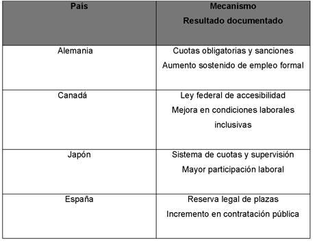 La evidencia comparada demuestra que las leyes declarativas sin mecanismos de implementación tienen bajo impacto, en cambio, las reformas que incorporan obligaciones claras, mecanismos de cumplimiento, supervisión institucional e incentivos económicos son las que logran resultados tangibles y medibles en inclusión laboral.