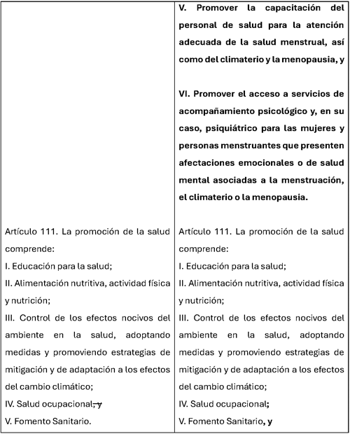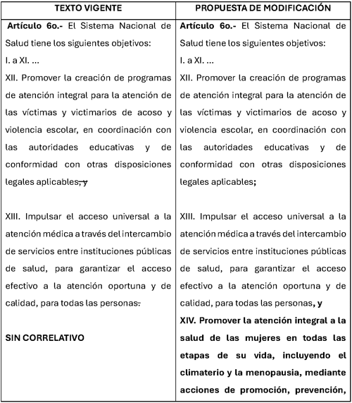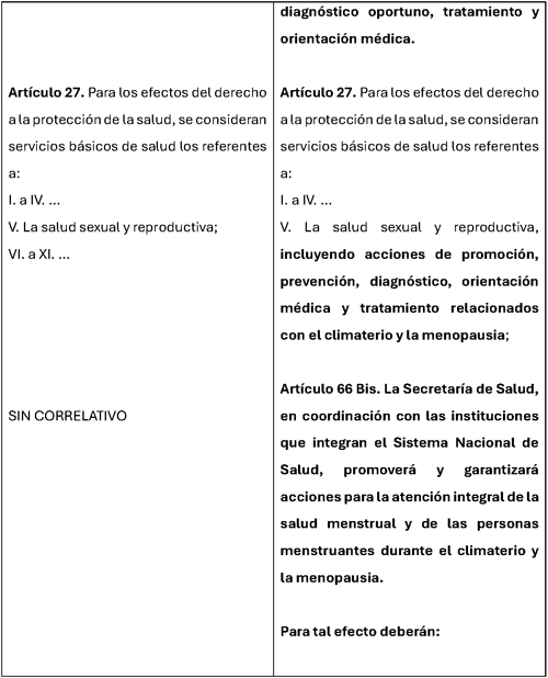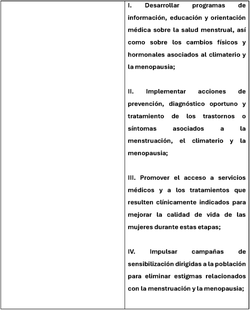 Fortalecer el marco jurídico en materia de salud para incorporar de manera explícita la atención integral de la salud menstrual, así como la atención médica durante el climaterio y la menopausia, permitirá impulsar políticas públicas que promuevan la prevención, el diagnóstico oportuno y el acceso a tratamientos adecuados. Asimismo, contribuirá a generar información, programas de educación y acciones de sensibilización que permitan reducir estigmas y mejorar la calidad de vida de millones de mujeres.