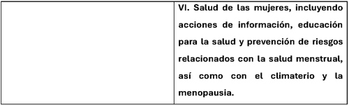 VI. Salud de las mujeres, incluyendo acciones de información, educación para la salud y prevención de riesgos relacionados con la salud menstrual, así como con el climaterio y la menopausia.