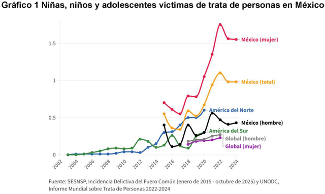 Por otro lado, es importante recalcar que México, es país de origen, tránsito y destino de personas víctimas de trata, situación que se agudiza en las regiones fronterizas y en corredores migratorios, donde las personas migrantes, especialmente niñas y adolescentes no acompañadas, enfrentan un riesgo elevado de captación y explotación.