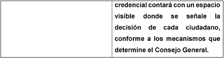 6. Con relación a la manifestación expresa y voluntaria para la donación de órganos y tejidos, la credencial contará con un espacio visible donde se señale la decisión de cada ciudadano, conforme a los mecanismos que determine el Consejo General.