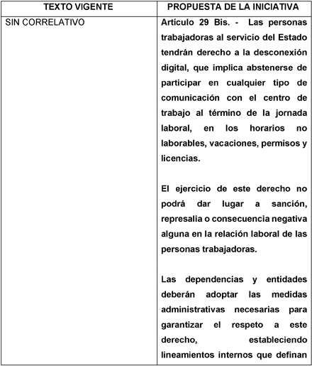 Artículo 29 Bis. - Las personas trabajadoras al servicio del Estado tendrán derecho a la desconexión digital, que implica abstenerse de participar en cualquier tipo de comunicación con el centro de trabajo al término de la jornada laboral, en los horarios no laborables, vacaciones, permisos y licencias.