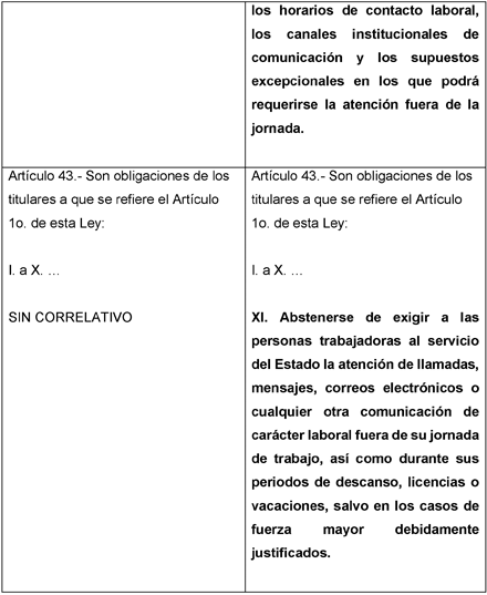En ese sentido, es necesario garantizar que todas las personas trabajadoras al servicio del Estado cuenten con mecanismos jurídicos que protejan efectivamente su derecho al descanso, que ley aplicable por sí misma lo defina y protege como un derecho y una obligación del patrón, para así aseguren un equilibrio adecuado entre la vida laboral, personal y familiar, reconociendo así que el uso de tecnologías digitales no debe traducirse en una disponibilidad permanente que afecte su tiempo de reposo y su desarrollo fuera del ámbito laboral.