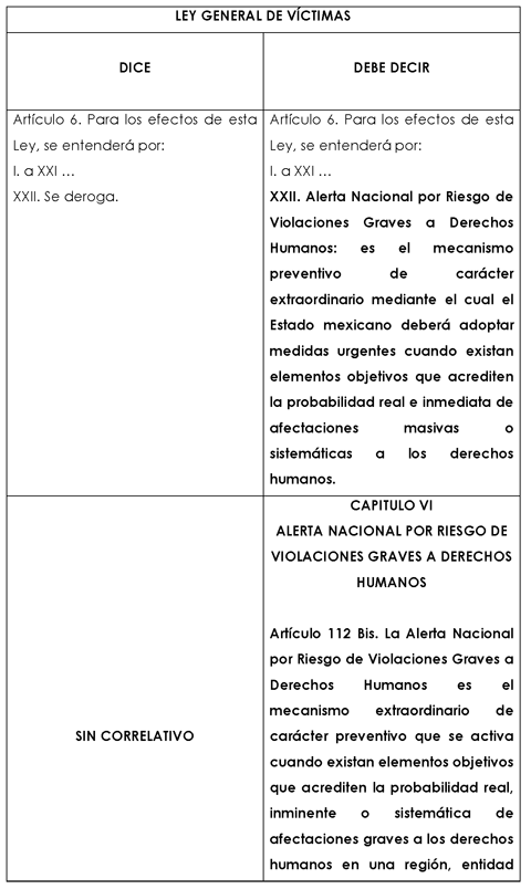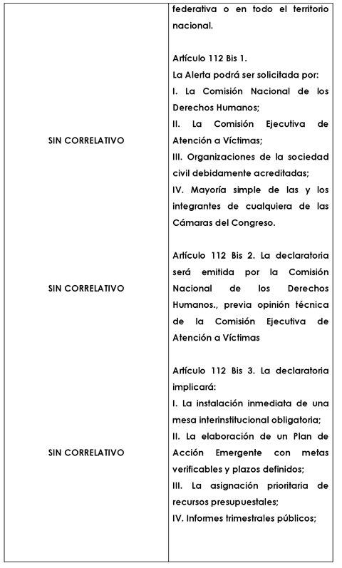 Se propone la adición de un Capítulo VI en el Título Sexto de la Ley General de Víctimas para incorporar tiene como finalidad incorporar un mecanismo extraordinario y preventivo que permita al Estado actuar antes de que se consumen afectaciones masivas o sistemáticas a derechos fundamentales, en cumplimiento del deber de prevención establecido en el artículo 1º constitucional y desarrollado por la Corte Interamericana de Derechos Humanos respecto del riesgo real e inmediato; el artículo 112 Bis define la naturaleza jurídica del mecanismo como preventivo, extraordinario y sustentado en elementos objetivos para evitar discrecionalidad política; el 112 Bis 1 amplía la legitimación para solicitar la alerta a órganos autónomos, autoridades especializadas, organizaciones de la sociedad civil y al Congreso, garantizando pluralidad y control democrático; el 112 Bis 2 atribuye la declaratoria a la Comisión Nacional de los Derechos Humanos, con opinión técnica de la Comisión Ejecutiva de Atención a Víctimas, asegurando independencia y rigor técnico; el 112 Bis 3 establece efectos jurídicos concretos, mesa interinstitucional obligatoria, plan de acción emergente con metas verificables, asignación prioritaria de recursos, informes trimestrales públicos y medidas diferenciadas para poblaciones en situación de vulnerabilidad, dotando al mecanismo de operatividad real y no meramente declarativa; finalmente, el 112 Bis 4 fija una duración temporal acotada de seis meses prorrogables, respetando el principio de proporcionalidad y el federalismo, de modo que la incorporación de esta figura fortalece las garantías de no repetición, transforma el modelo reactivo en uno preventivo y consolida al Estado mexicano como garante efectivo de los derechos humanos frente a riesgos estructurales.