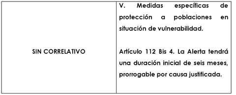 Artículo 112 Bis 4. La Alerta tendrá una duración inicial de seis meses, prorrogable por causa justificada.