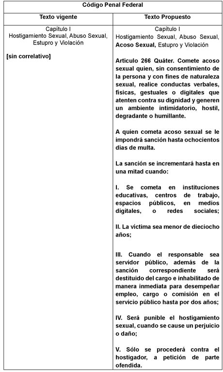 El cuadro que a continuación se presenta, sintetiza en qué consiste el proyecto de decreto de la iniciativa con proyecto de decreto por el que se adiciona el artículo 266 Quáter del Código Penal Federal en materia de acoso sexual; propuesta: