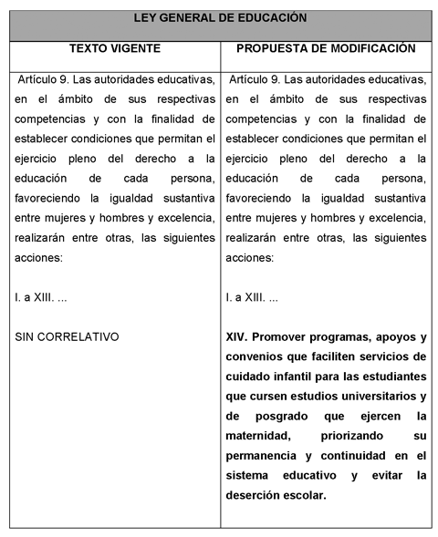 En ese sentido, la presente iniciativa propone reformar la Ley General de Educación y la Ley General de Educación Superior con el objetivo de promover programas, apoyos o convenios que faciliten el acceso a servicios de cuidado infantil para madres estudiantes, favoreciendo su permanencia y continuidad en el sistema educativo y contribuyendo a generar condiciones de mayor equidad e inclusión.