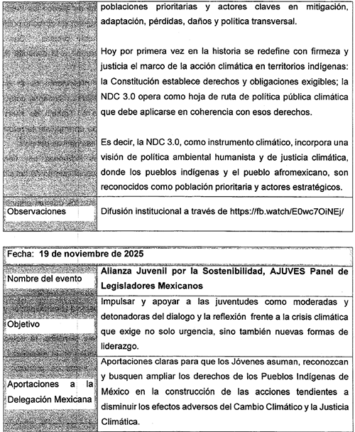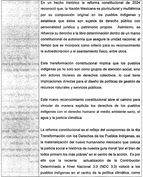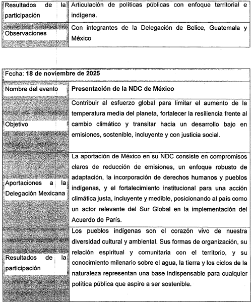 Uno de los logros más relevantes fue poder respaldar los grandes avances que nuestra Nación presento a través de la secretaria de Medio Ambiente y Recursos Naturales, la doctora Alicia Bárcena Ibarra quien gracias a su enfoque y sensibilidad logró la consolidación del reconocimiento en la NDC 3.0 de los pueblos indígenas como principales preservadores de la biodiversidad y de los recursos naturales, subrayando su papel histórico y actual en la protección de ecosistemas estratégicos, bosques, selvas, mares y territorios bioculturales.