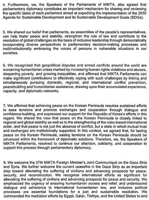 Denunciamos el incremento del unilateralismo y, también, expresamos nuestro compromiso de colaborar en la resolución de las crisis globales, tales como los conflictos armados, el cambio climático, las crisis económicas y social, así como la polarización social. Coincidimos en la importancia del parlamento como una institución que promueve la paz, la democracia, la estabilidad, el Estado de Derecho y contribuyen a la resolución de desafíos globales.