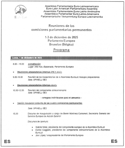 Los parlamentarios miembros del Componente Latinoamericano de Euro-Lat, integrantes del Parlamento Andino el Parlamento Centroamericano, el Parlamento Latinoamericano y Caribeño, el Parlamento del Mercosur, la Comisión Parlamentaria Mixta Chile-UE y la Comisión Parlamentaria Mixta México-UE, reunidos en el marco de las reuniones de las comisiones permanentes de la Asamblea Parlamentaria Euro-Latinoamericana, celebradas del 1 al 3 de diciembre de 2025 en el Parlamento Europeo en la ciudad de Bruselas, Reino de Bélgica:
